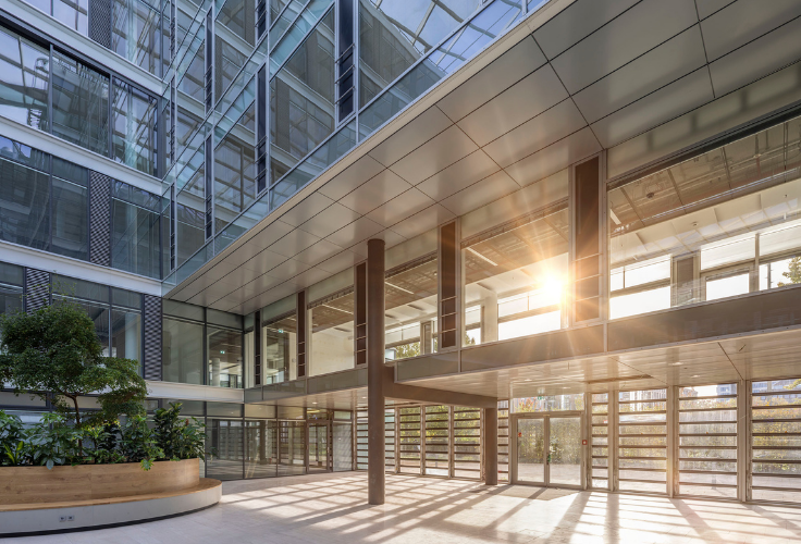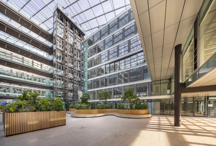 Wer das heylo betritt, spürt sofort: Hier ist Arbeiten anders. Das großzügige Atrium mit seiner gläsernen Fassade und dem Sonnendach ist mehr als ein architektonisches Highlight – es ist der lebendige Mittelpunkt des Hauses. Ob Cappuccino oder Brainstorming auf der Piazza oder ein kurzer Moment Ruhe in der Oase: das Atrium verbindet nicht nur Etagen, sondern auch Menschen. Das Refurbishment zeigt: Strahlkraft entsteht nicht nur durch Design, sondern auch durch nachhaltige Planung. Das heylo vereint ökologische Verantwortung mit modernem Arbeitskomfort.